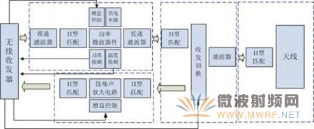 通過前面的討論,我們已經知道,功率放大器是由帶通濾波器,Π型匹配網絡,功率微波器件,增益控制,供電電路,功率檢測,溫度檢測低通濾波器這些部分組成的;低噪聲放大器是由Π型匹配網絡,低噪聲放大電路和增益控制組成的;收發切換器是由Π型匹配網絡,切換芯片,濾波器組成的;天線和連線連接器部分是由Π型匹配網絡和連接器組成的。于是,我們得到了Wi-Fi產品一般射頻電路的詳細框圖,如圖7-2所示。