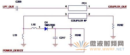 我們在這里用單獨的一節來討論外圍的檢測電路,其實要講的就是Atheros的方案,因為這個設計實在是太有個性了,讓我們來一起見識一下吧。如圖3-10所示,就是Atheros常用的功率檢測方案。圖中的PC1就是一個印制耦合器(Printed Coupler),來自功率放大器的輸出信號LPF_OUT經過耦合器,就在2,3腳感應到高頻交變電壓,這個電壓隨著輸出功率的增大而增大L18,L19,D1,C217,R248組成了常規的整流電路,這樣,就得到了隨著輸出功率的變化而變化的直流電壓POWER_DETECT,無線收發器就可以得到這個電壓值從而做作出相應的動作。