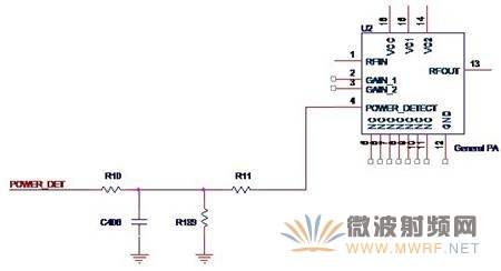 我們在圖3-2中已經看到,一般的功放芯片會有POWER_DETECT這樣的一個管腳,這個管腳的作用就是用于功率檢測的。使用芯片內建的功率檢測功能可以簡化電路設計,常見的完整形式如圖3-9所示。