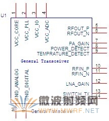 收發器通常會有很多的管腳,在如圖2-1中,我只給出了射頻電路設計時會關注的管腳,可以看到,有幾個電源管腳,數字地,模擬地,射頻輸出,功率放大器增益控制,功率檢測,溫度檢測,射頻輸入,低噪聲放大器增益控制,發射、接收切換等管腳,在接下來的內容中,我會把這些管腳分模塊逐個講解。