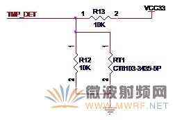 圖3-12給出的是Ralink的典型的溫度檢測電路。圖中的RT1是熱敏電阻,當環境溫度改變時,自身的阻值會發生變化,這樣,顯而易見,TMP_DET的值就會發生變化,這樣,收發器就可以檢測到環境的溫度了。溫度檢測電路一般會放置在功放芯片的附近。