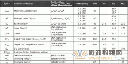 微波器件(晶體管或芯片)的參數,基本上就決定了低噪聲放大器的性能,我們來看一下最常用的SGA-8343的參數,如圖4-2所示。圖中給出的參數包括最大增益,噪聲系數,S21,工作頻率,供電電壓,消耗的電流等等。對于專用的低噪聲放大器芯片,參數也基本如此,在這里我們就不詳細說了。
