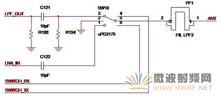 如圖5-3所示,就是Atheros的典型發射與接收回路SW10就是那顆切換芯片。LPF_OUT是來自功率放大器的輸出信號,R186,C121與R194組成了Π型匹配網絡,LNA_IN是送至低噪聲放大器的信號,SWITCH_TX與SWICTH_RX這兩個信號的組合就控制著是打開發射通路還是打開接收通路。