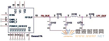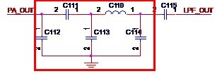 濾波器的設計需要很復雜的計算,在這里我不想探討過多的理論知識,所以,我就不給出如何計算的方法,只給出一般的低通濾波器的形式。這里需要指出的是,Atheros的設計一般會使用三個元件,而Ralink一般會使用五個元件。如圖3-7所示,是Ralink常用的濾波器形式。在圖中,C112,C111,C113,C110和C114就組成了一個低通濾波器,來自功放芯片的信號PA_OUT經過濾波器后得到LPF_OUT這信號送至后續電路。