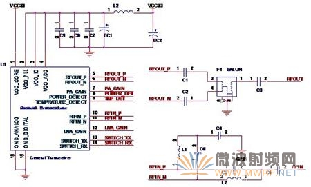 想必大家應該比較清楚那三部分的結構了,好,讓我們來試一下,在圖2-2那個芯片的外圍放置一些器件,再連上幾條線,完成無線收發器及其外圍電路設計。在這里,我們對收發器輸出的差分信號用平衡器處理得到單端信號RFOUT,來自低噪聲放大器的接收信號RFIN用分立元件處理得到差分信號RFIN_P,RFIN_N。這樣,就得到了如圖2-11所示的原理圖。