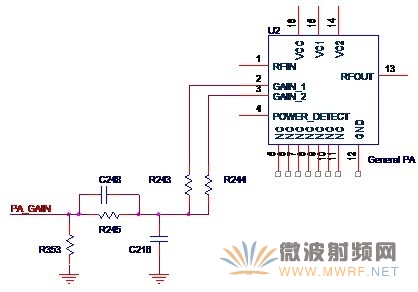 增益控制的作用就是可以改變功放電路的增益,從而能改變輸出功率。改變功率放大器最終輸出功率的方法有兩種,一種是無線收發器改變自身的輸出功率,另外一種就是改變功放電路的增益,在這里我們主要關注后者。通常功放芯片的增益控制管腳會有兩個或者兩個以上,分別改變的是第一級放大和第二級放大的增益值,圖3-11是典型的增益控制原理圖。來自收發器的控制信號PA_GAIN經過R245和C248組成的RC濾波電路(濾除來自收發器的可能的交流成分)通過兩個電阻作用于功放芯片的GAIN_1和GAIN_2兩個管腳,從而控制功率放大電路的增益,也控制著最終的輸出功率。
