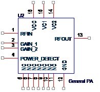 值得注意的是,GAIN_1和GAIN_2是來自收發器(Transceiver)的控制信號,是直流電壓,POWER_DETECT是功放芯片輸出的發射功率檢測值,也是直流電壓,而RFIN和RFOUT是最重要的射頻信號管腳。