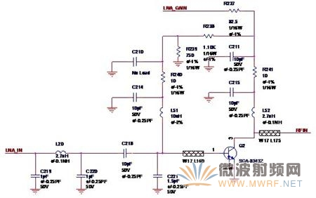圖中的LNA_GAIN是來自無線收發器(Radio Transceiver)的增益控制信號,放大器使用的晶體管就是最常用的SGA-8343,R238,R239,R240是基極的偏置電阻,C219,L20,C220組成了低通濾波器,來自切換芯片(Switch)的LNA_IN通過低通濾波器之后經由C218耦合至低噪聲放大器,Q2與C221,L51,C214,R240,C210,R239,R238,C211,R241,C215,L52組成了共射極放大電路,最終輸出RFIN送至收發器進行處理。