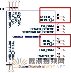 對于射頻信號,為了增強收發器的抗干擾能力,一般會采用差分信號的處理方式,也就是說,收發器會以差分形式將信號發送出去,同時外部電路也必須為收發器提供差分射頻信號的輸入。如圖2-2所示,紅色方框內的四只管腳就是這個收發器的差分射頻信號的輸入,輸出管腳,也是最重要的射頻信號管腳。